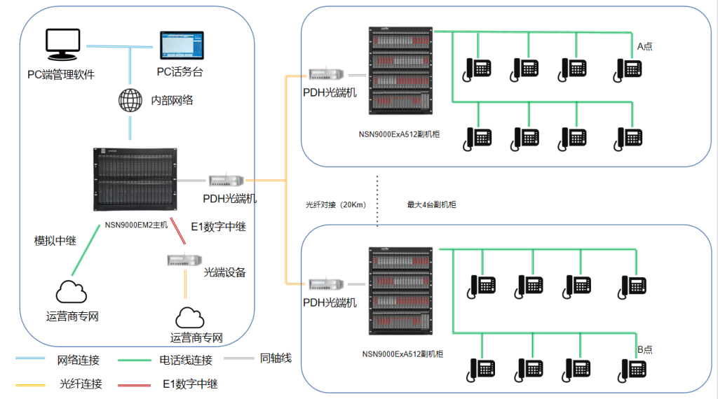 接入8个副机柜(光纤对接,默认20km),容量1024分机