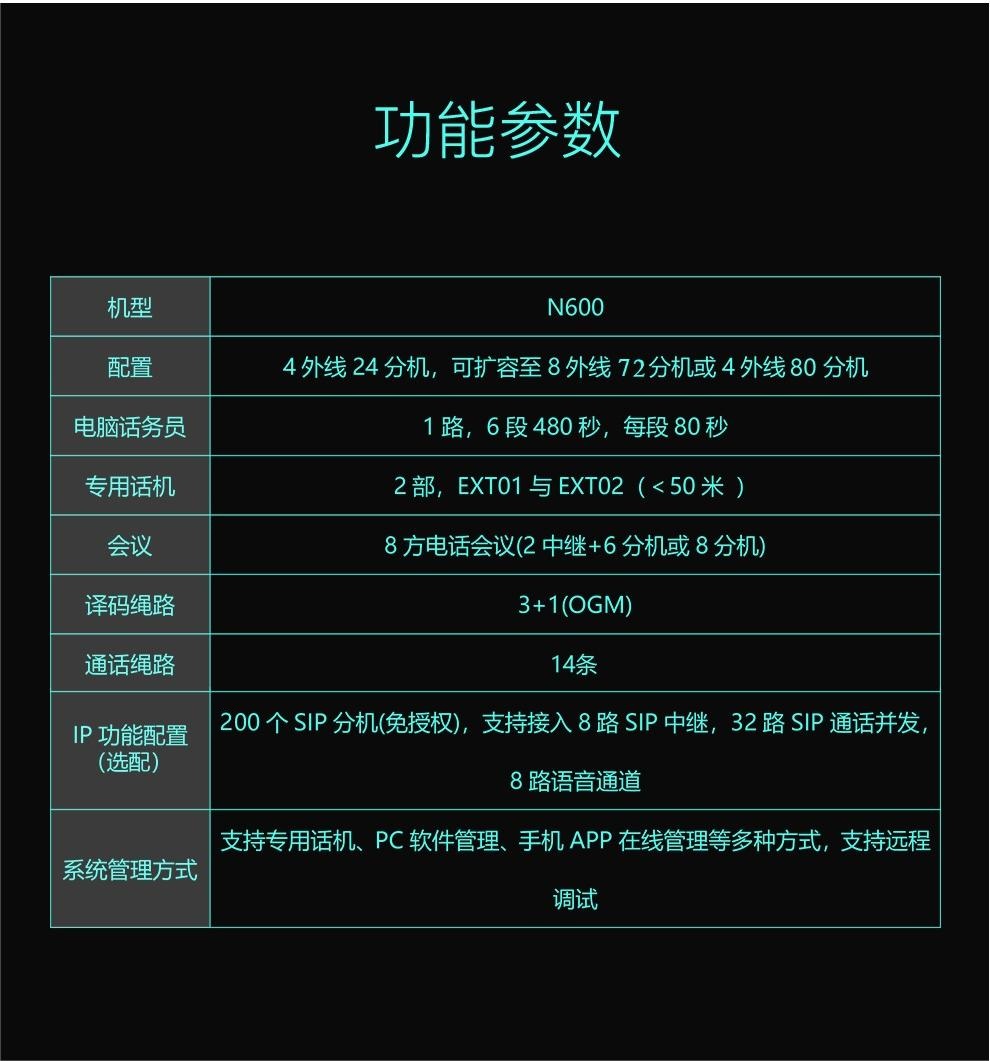 1)基本配置:4外线24分机,最大可扩容到8外线72分机或4外线80分机